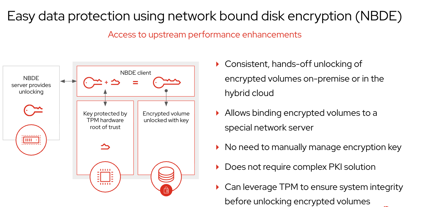 This approach offers consistent, hands-off unlocking of encrypted volumes, whether on-premise or in the hybrid cloud. It simplifies key management and doesn’t require complex PKI solutions. Plus, it can leverage TPM for enhanced system integrity.