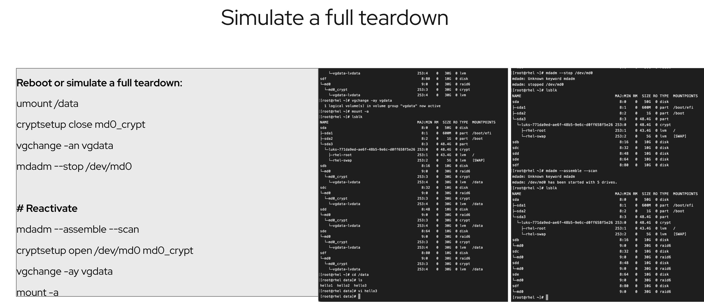 • This test involved simulating a full teardown (unmounting, closing cryptsetup, deactivating volume groups, and stopping mdadm) and then reactivating the disks by reassembling mdadm, opening cryptsetup, activating volume groups, and mounting the filesystems.